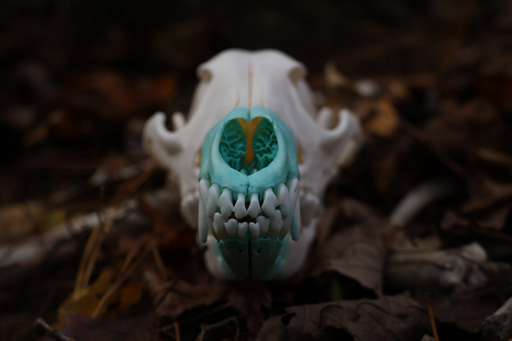 Blue Copper Stained Coyote Skull for sale! You will receive the Naturally Stained Coyote Skull pictured. There are no missing teeth. This skull has been stained with a copper solution. Please refer to the photos! Length 7.5'' Width 3.5'' Height 3''